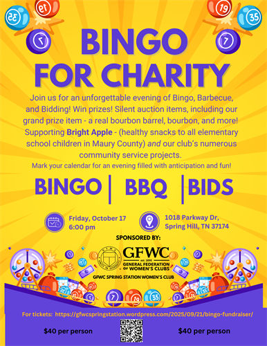 The GFWC Spring Station Woman's Club's first BINGO fundraiser will be Friday, October 17, at 6:00 pm in the Spring Hill Events Center, 1018 Parkway Dr, Spring Hill, TN 37174. $40 per person includes a meal furnished by award-winning Edley's Barbecue, 10-15 bingo games with prizes, a silent auction, and more fun! You will have the option to purchase additional bingo cards to increase your chances of winning!