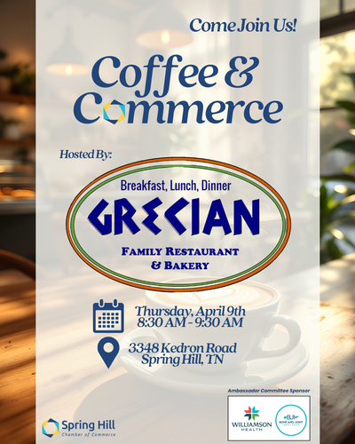 Connect with us for Coffee & Commerce, our monthly morning networking event designed to help local business professionals build relationships, exchange ideas, and stay connected with the Spring Hill community.