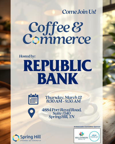 Connect with us for Coffee & Commerce, our monthly morning networking event designed to help local business professionals build relationships, exchange ideas, and stay connected with the Spring Hill community.