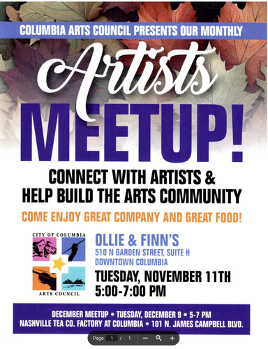 Join the Columbia Arts Council for our monthly Artists Meetup, a welcoming space for local creatives to connect, collaborate, and strengthen the arts community! Whether you're a visual artist, musician, writer, performer, or simply passionate about the arts, this casual gathering is the perfect opportunity to meet fellow artists, share ideas, and get inspired. Enjoy great company, meaningful conversation, and delicious food while helping support and grow the arts scene in Columbia.