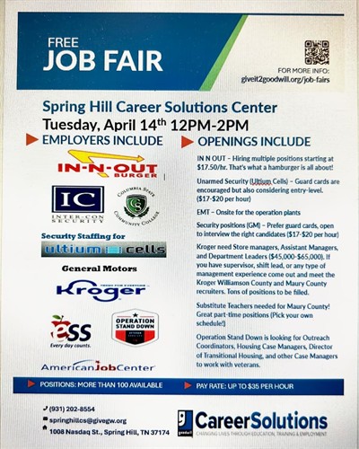 Over 100 + positions need to be filled! Companies that will be in attendance: IN N OUT, Kroger, Operation Stand Down, Columbia State Community College, ESS Maury County Substitutes, IC Security, staffing for GM and Ultium Cells, and of course Goodwill Jobs from entry-level, management to corporate in Nashville. Visit Goodwill Career Solutions in Spring Hill, April 14th, from 12PM-2PM and get hired!