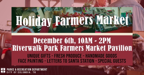 The Parks and Recreation Department of the City of Columbia will host Holiday Farmers Market at Riverwalk Park at 104 Riverside Drive, Columbia. Click