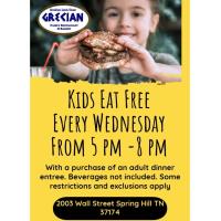 Kids Eat Free with the purchase of an adult entree every Wednesday at Grecian Family Restaurant and Bakery! ... read more